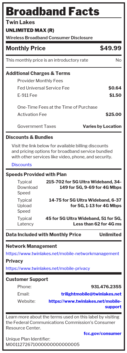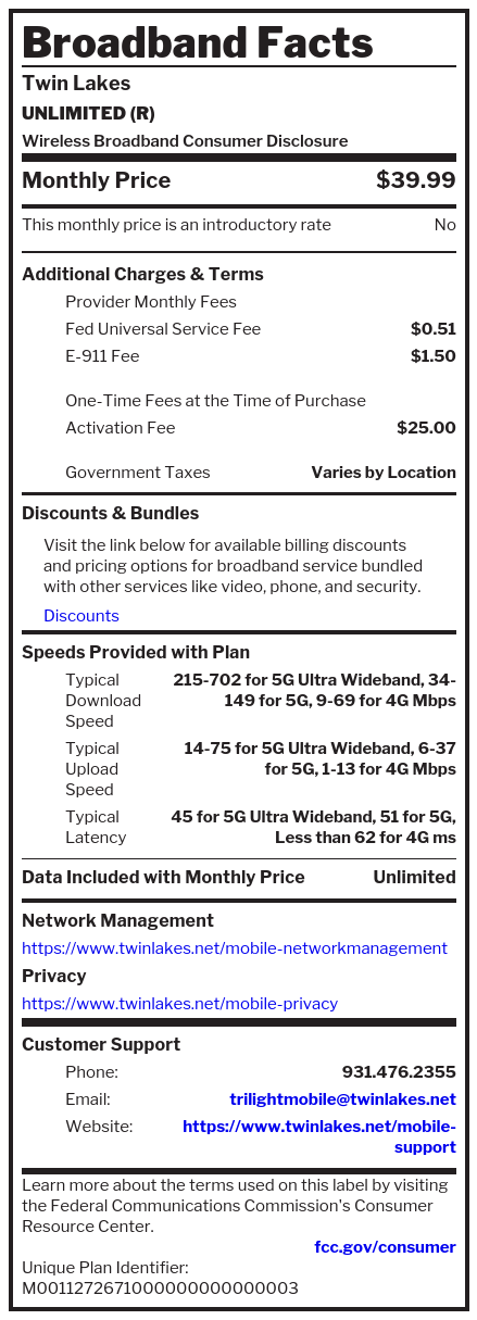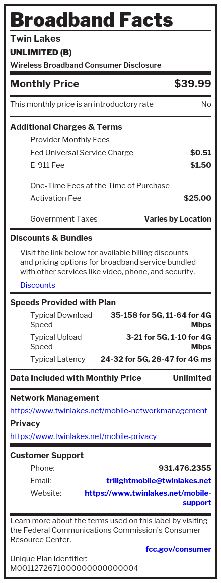 Wireless Broadband LabelsWhat’s in your Trilight Mobile plan? For machine readable labels, click here.